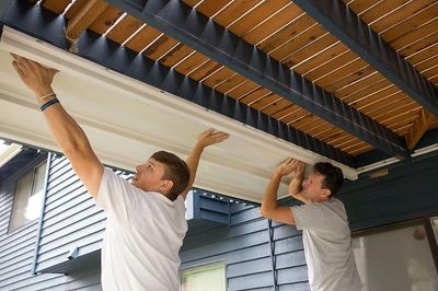 An under-deck waterproof system is installed beneath an elevated deck to collect rainwater that passes through the deck boards. The system channels water toward a gutter or drainage point, keeping the area below dry and protected.